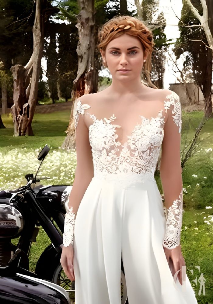 Ce qui est top avec cette combi, c’est vraiment ce jeu de contraste entre le buste mesh brodé et la fluidité du pantalon palazzo. Le haut, il faut dire, mise tout sur cette transparence nude ultra travaillée : un mesh recouvert de dentelle florale blanche en relief qui habille les épaules, le décolleté et descend joliment sur les manches longues jusqu’aux poignets. L’effet visuel est franchement réussi. On aperçoit la peau à travers le tissu transparent orné de broderies appliquées, c’est vraiment élégant. Le décolleté plongeant forme un V d’environ 12 cm qui structure tout le buste. La taille haute marque visuellement la séparation avec le bas : un pantalon blanc à jambes larges qui tombent jusqu’au sol en créant cette ampleur caractéristique, vous voyez l’idée. Côté dos, ça mérite qu’on s’y attarde : même mesh brodé avec une découpe centrale qui plonge jusqu’aux reins, maintenue par de fines bretelles ornées de broderie. En gros, cette combinaison élégante équilibre parfaitement la transparence travaillée du haut et l’opacité fluide du bas, idéale pour un mariage civil ou une soirée habillée. Mon conseil perso : avec des escarpins nude et une pochette dorée, c’est le top absolu. Les broderies florales en relief captent la lumière et créent cette texture qui change selon l’angle, c’est assez bluffant.