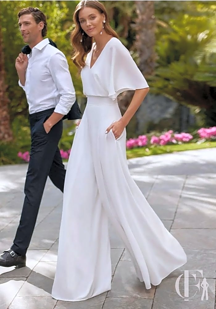 Ce qui séduit tout de suite, c’est vraiment cette découpe du dos. Ce dos ouvert descend franchement bas, jusqu’aux reins, et se trouve sublimé par une rangée de boutons perlés qui file le long de la colonne vertébrale. Un détail signature, il faut le dire, qui change complètement la donne niveau silhouette vue de dos. Sur le devant, le col V plonge assez profond sans être excessif, créant un équilibre visuel avec l’arrière (enfin, vous voyez l’idée). Les manches courtes se distinguent par leur forme cape, ce tissu fluide qui tombe délicatement sur les bras et bouge avec chaque mouvement. Le pantalon adopte une coupe palazzo avec des jambes larges qui descendent jusqu’au sol. La taille haute, visiblement ajustée, marque la silhouette et allonge les jambes de façon naturelle. Le tissu semblerait être du crêpe ou un satin mat, avec cette texture qui reste structurée sans rigidité. Cette combinaison blanche fonctionne particulièrement bien pour un mariage civil ou une cérémonie moderne. Le blanc immaculé et la coupe épurée permettent d’accessoiriser selon les envies. D’ailleurs, petit conseil : avec des escarpins nude et des bijoux dorés minimalistes, c’est le top pour un look réussi. Les poches latérales discrètes ajoutent une touche pratique (et ça, c’est vraiment appréciable). En gros, c’est une pièce chic qui mise tout sur la coupe et les détails architecturaux plutôt que sur l’ornementation excessive.