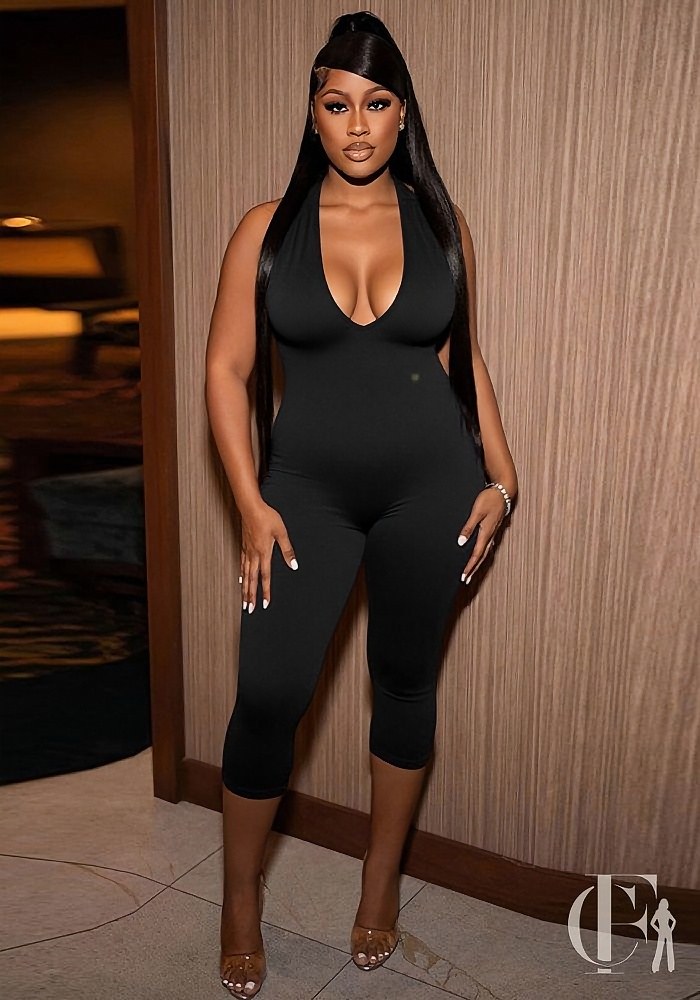 Pour commencer, ce qui attire vraiment l’œil, c’est ce col V profond qui plonge franchement bas. Il crée une ligne verticale vraiment flatteuse qui affine le buste, c’est assez bluffant. Les bretelles, larges de 4 cm, contournent la nuque de manière élégante pour former un dos nu intégral qui descend jusqu’au bas des reins. Aucune fermeture visible à l’arrière, le rendu est impeccable. La matière brillante, légèrement texturée, sculpte la silhouette grâce à son élasticité bien dosée. Pas trop rigide, vous voyez, juste ce qu’il faut pour structurer sans cette sensation de compression. Le pantalon capri ajusté s’arrête précisément à mi-mollet, une longueur stratégique qui met vraiment en valeur les chevilles. D’ailleurs, ça se marie parfaitement avec des escarpins à brides comme sur les photos. La petite ceinture ornée d’un détail doré ou d’une chaîne strass marque la taille naturelle, ajoutant cette touche glamour sans tomber dans l’excès. Petit conseil : avec des accessoires dorés minimalistes, le look est encore plus sophistiqué. La construction sans couture apparente sur le devant garantit un rendu épuré, vraiment idéal pour les soirées chic ou sorties en club où l’on cherche un look sophistiqué assumé. Il faut dire que la matière capte la lumière selon l’angle, créant des reflets subtils qui renforcent l’aspect habillé de cette combinaison moulante. En gros, c’est une pièce pensée pour les occasions où l’on veut affirmer une élégance moderne, entre sensualité maîtrisée et confort de mouvement. Mon astuce perso : portez-la avec une pochette clutch métallisée pour un effet total look réussi.