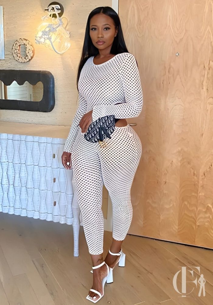 Un truc à savoir : cette résille blanche à pois ne laisse absolument rien à l’imagination. Le tissage ajouré, c’est du transparent intégral qui révèle tout ce qui se trouve en dessous, créant ce contraste assumé entre le blanc du tissu et les sous-vêtements noirs qu’on aperçoit par transparence. Niveau coupe, on est sur du vraiment moulant. La coupe moulante près du corps épouse chaque courbe sans serrer, avec des manches longues qui vont jusqu’aux poignets et un col rond tout simple à la base du cou. C’est carrément du seconde peau, il faut le dire. Le pantalon descend jusqu’aux chevilles en gardant cette même proximité avec les jambes. À la taille, on retrouve un lacet noir contrastant qui traverse le devant, permettant d’ajuster le serrage comme on veut. D’ailleurs, petit conseil perso : jouez avec ce lacet pour créer différents effets de style. Le dos, lui, adopte exactement le même tissage transparent, laissant apparaître la peau et la lingerie portée en dessous. Question confort, le tissu maille extensible suit les mouvements naturellement, sans aucune rigidité. Cette pièce audacieuse, franchement, joue à fond sur l’effet visuel de la transparence : la résille structure l’ensemble, mais ce sont vraiment les dessous qui déterminent le niveau de couverture final. Parfait pour des soirées privées ou des looks créatifs en superposition, où l’audace devient carrément l’élément central du style. Mon astuce : portez-la avec des talons hauts et des accessoires minimalistes pour un rendu ultra sophistiqué.