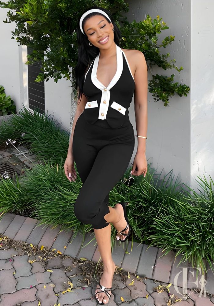 Ah ! j’ai oublié de vous dire, ce qui saute aux yeux en premier, c’est vraiment cette bande blanche centrale qui descend du col jusqu’à la taille, structurant toute la partie haute avec ses quatre boutons dorés bien alignés. Ça rappelle franchement les vestes de service traditionnelles, vous voyez le genre. Le col V profond, encadré de blanc, attire naturellement le regard vers le décolleté tout en gardant, disons, une certaine élégance professionnelle. Les poches plaquées blanches rectangulaires, placées symétriquement à hauteur de taille, ajoutent un côté fonctionnel vraiment pratique pour le service en restaurant. Le buste noir ajusté contraste joliment avec le pantalon coupe capri qui reste sobre et fluide. D’ailleurs, cette coupe capri qui tombe juste sous le mollet, c’est assez malin : elle allonge pas mal la jambe grâce aux coutures structurantes visibles sur les cuisses. La taille haute gainante marque la silhouette de façon naturelle sans comprimer, un vrai plus pour les longues journées en hôtellerie. Le tissu, visiblement stretch et mat, épouse les formes sans créer de tension disgracieuse, ce qui garantit une liberté de mouvement appréciable. Petit conseil perso : avec des escarpins noirs, le rendu est top pour un look service classe. En gros, cette combinaison bicolore trouve l’équilibre, ou plutôt disons, le juste milieu entre l’élégance des détails blancs et dorés et le côté pratique du noir dominant, parfait pour un environnement de travail chic.