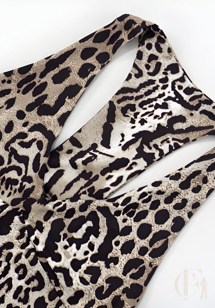 D’ailleurs, petit conseil, ce qui capte le regard en premier, c’est vraiment cet imprimé léopard beige et noir qui s’étend de façon uniforme sur toute la pièce, depuis les bretelles jusqu’aux chevilles. Franchement, la coupe ultra-moulante sculpte chaque courbe avec précision grâce à un tissu stretch lycra brillant, offrant cet effet seconde peau qui épouse sans jamais comprimer (et ça, c’est vraiment appréciable). Le décolleté V plongeant d’environ 12 cm se marie avec des bretelles halter de 3 cm de large qui se nouent derrière la nuque, créant cette allure sophistiquée idéale pour une soirée club ou une discothèque. Il faut dire que le véritable détail signature, c’est ce dos nu intégral qui descend jusqu’aux reins : les bretelles se croisent en Y dans le dos, formant une ouverture dorsale d’environ 35 cm qui dévoile la peau tout en maintenant parfaitement grâce à l’attache cervicale ajustable. On retrouve également un empiècement uni beige au niveau de la taille et du bas du dos, intégré sous l’imprimé pour un effet gainant discret mais vraiment efficace. Les coutures flatlock noires renforcent les zones de tension. La jambe longue descend jusqu’aux chevilles en restant parfaitement ajustée, sans élargissement. L’enfilage se fait par le haut, sans zip apparent. Mon astuce perso : avec des sandales transparentes, l’allure devient glamour épurée, tandis que des bottines à talons apportent ce côté rock assumé qui fait toute la différence.