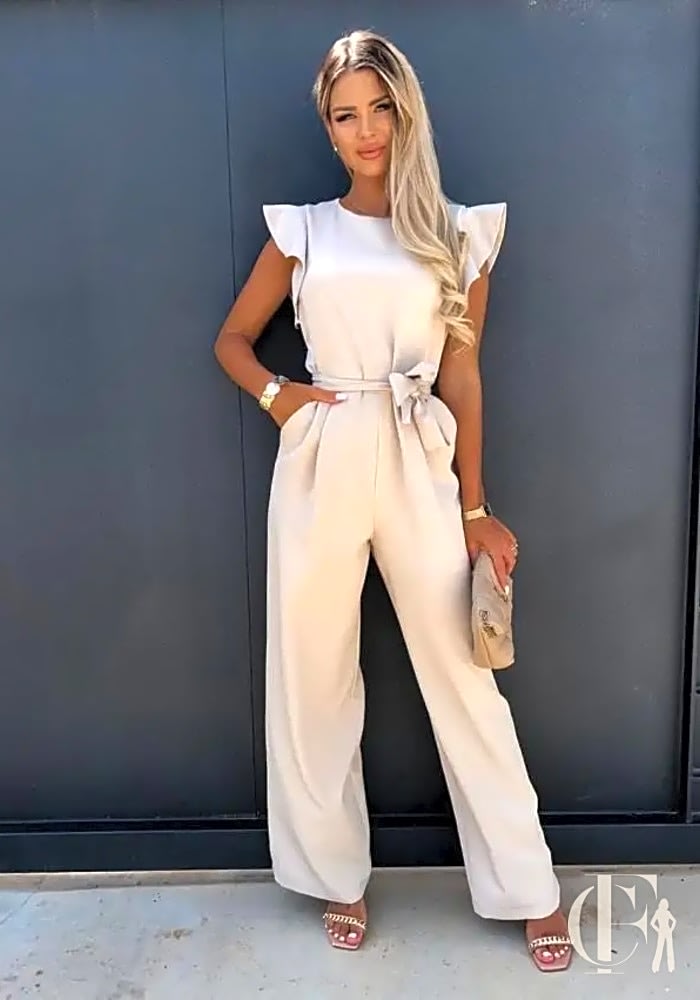 Bon à savoir : ce qui attire l’œil immédiatement, c’est ce jeu de contrastes entre le haut bien structuré et le bas ultra fluide, franchement. Les manches à volants courts viennent encadrer les épaules sur environ 8-10 cm, dans un tissu épais non doublé qui tient vraiment bien sa forme. L’encolure ronde reste assez classique. Le buste, lui, est ajusté sans être moulant, c’est parfait. Ensuite, il faut parler de cette ceinture nœud détachable d’environ 5 cm de large qui change carrément l’allure de la pièce : elle se noue devant, à la taille naturelle, avec deux pans qui tombent sur 15 cm environ. C’est elle qui structure toute la silhouette, en gros. Le pantalon palazzo taille haute démarre juste sous la poitrine et tombe droit jusqu’aux chevilles, avec ce léger évasé qui crée du mouvement à chaque pas. Deux poches latérales sont intégrées dans les coutures des hanches, visibles mais discrètes. Au dos, une fermeture invisible (probablement un zip central) garde la ligne bien épurée. Trois coloris disponibles : blanc cassé écru, bleu ciel vif et rose fuchsia intense, vraiment punchy. La matière tissée mate présente un léger aspect texturé, plutôt dans le style crêpe ou polyester léger. Pour une soirée chic ou un mariage, cette combinaison élégante offre le confort d’un pantalon avec la tenue d’une robe de cérémonie, c’est l’idéal. Les volants et le nœud ajoutent cette touche féminine sans tomber dans l’excès. Petit conseil perso : avec des escarpins nude et des bijoux dorés, le rendu est vraiment top pour allonger la silhouette.