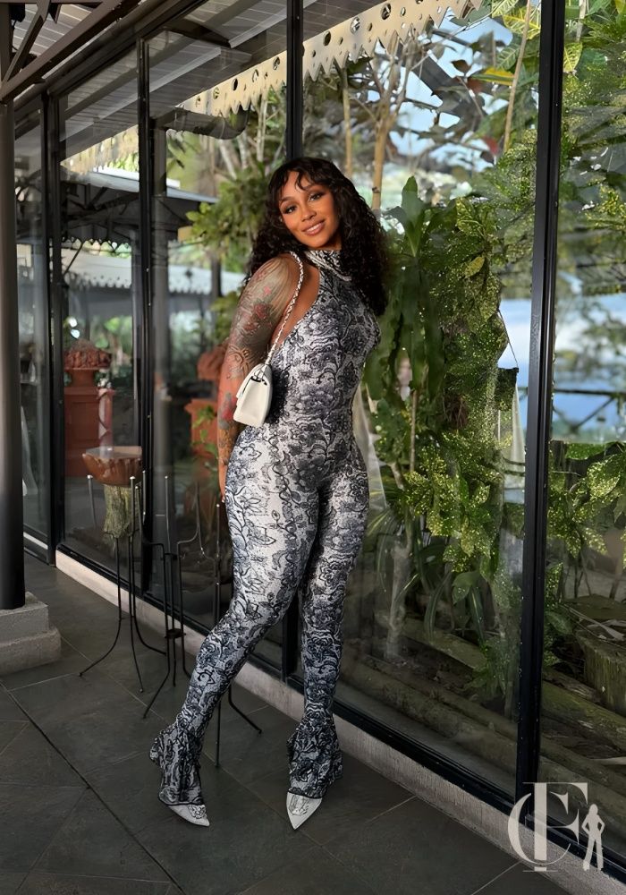 Dès le premier regard, c’est vrai que ce motif arabesque noir sur fond blanc capte immédiatement l’attention. Il traverse littéralement toute la pièce, du col jusqu’aux talons coordonnés. La construction, il faut le dire, se compose de deux éléments distincts : un justaucorps col montant avec cette attache tour de cou qui dégage complètement le dos jusqu’aux reins (et franchement, l’effet est saisissant), puis un pantalon palazzo dont les jambes ultra fluides effleurent le sol. Le jeu de noir et blanc évoque clairement les ornements orientaux réinterprétés, avec ces volutes graphiques qui génèrent un rendu visuel plutôt sophistiqué. D’ailleurs, niveau buste, la coupe seconde peau sculpte vraiment la silhouette. Pendant ce temps, le bas évasé insuffle du mouvement à chaque déplacement. Le tissu légèrement stretch, c’est le détail malin : il offre une vraie liberté de mouvement sans sacrifier la structure ajustée du haut. Ce qui rend cette pièce vraiment unique, disons-le, c’est cette coordination totale avec les talons pointus blancs imprimés du même arabesque. Ça crée une continuité visuelle du col jusqu’aux pieds, franchement bluffant. En gros, vous recevez une tenue soirée complète, clé en main, sans passer des heures à chercher les accessoires assortis. La ligne continue allonge naturellement la silhouette, effet amplifié par la coupe haute du pantalon qui démarre juste sous le buste. Mon conseil perso : ajoutez des boucles d’oreilles dorées pour un finish parfait. Pour une soirée élégante ou un événement habillé, cette combinaison dos nu trouve ce juste équilibre entre sensualité maîtrisée et sophistication graphique, sans jamais basculer dans l’excès.